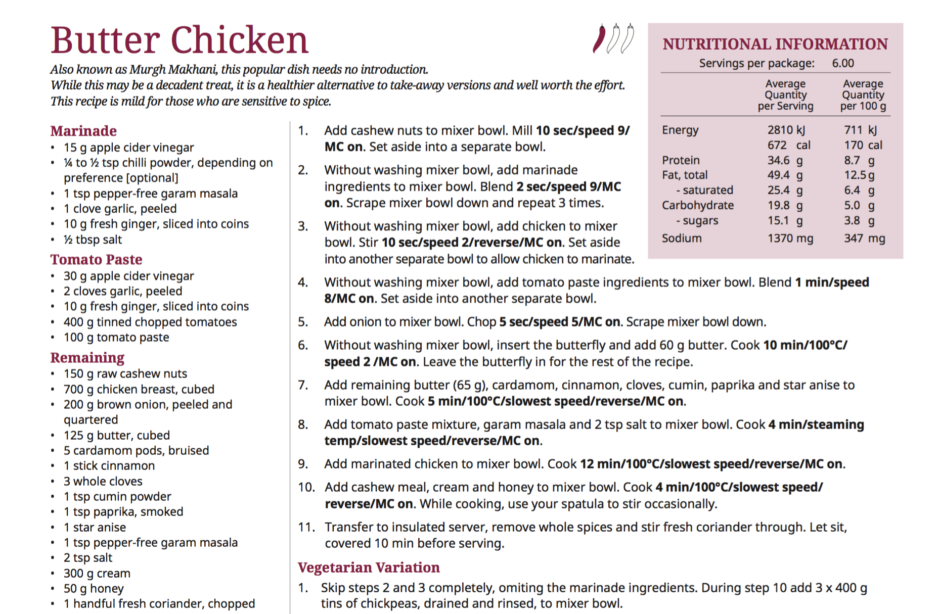 - Full nutritional information, including calories per serve, are provided for each recipe. The full macro nutritional information per ingredient are available via the cookbook.